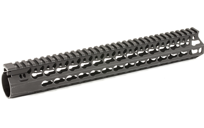 Bravo Company’s BCM KMR ALPHA 13″ KeyMod Free Float Handguard is manufactured from aluminum that is lightweight yet durable. It also features a proprietary patent pending mounting indexing and lock up system that mitigates 12:00 rail movement under heat generated from the barrel nut. Inner diameter is 1.3 inches and the outside is 1.5 inches flat to flat. The handguard flares forward (towards muzzle end) at the 3 and 9 O’clock positions approximately 1/4 inch and the actual length when measured to flare is 10.5 inches. The KeyMod interface system was developed by Eric Kincel (now the Director of BCMs’ product development team) to work in parallel with the current picatinny system. In many applications it will advance modularity past the current 1913 rail system. The BCM KMR Alpha also allows for a larger range of modularity offering 4 different offset mounting positions between traditional 3″ 6″ 9 and 12:00 positions. In the most basic of applications the KeyMod system allows for universal modularity between various manufacturers of accessories and accessory rails. A big win for the trigger puller.