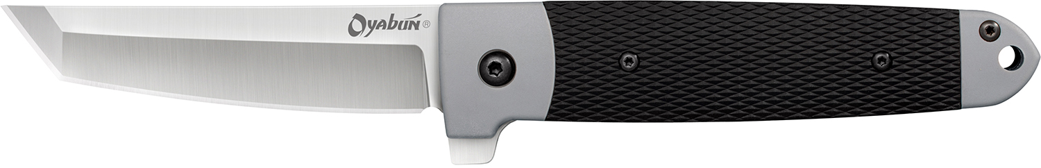 The Oyabun incorporates a reinforced blade point, a high satin polish, expert heat treatment and the sharp edge Cold Steel’s reputation was founded upon. Furthermore, it is equipped with an integral flipper for effortless opening and a leaf spring lock and safety. The 4034 stainless steel blade is housed in a strong, economical handle that’s reinforced with stainless steel liners. The handle is injection molded with a Griv-Ex foundation and then over molded with soft, checkered Kray-Ex fastened to the frame with two robust bolts.