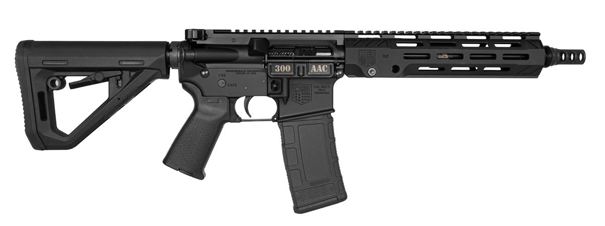 Diamondback Firearms DB-15 SBR Talo Finish: Black hard coat anodize Caliber: 300 AAC Blackout Barrel:Db Barrels, 10 in, 1:8 rh, medium, 4150 CrMov, Black Nitride Gas System:Carbine-length w/ superlative adjustable gas block BCG:Shot-Peened, Magnetic Particle Inspected Mil Spec 8620 Carrier Upper:A3 Flattop Forged 7075 T-6 Aluminum, T-Marked w/ silencerco gas defeating charging handle Lower: 7075 T-6 Aluminum (DB15 Carbon Lower) Handguard:9 in v3 M-LOK anti rotation s rail w/ full picatinny Grip: Magpul moe grip Stock: Magpul DT carbine stock Magazine: Magpul gen m2 pmag 30 rd Sights: none Muzzle device: Silencerco ASR Muzzle Brake 1/2×28 Trigger: Standard mil-spec Weight: 5.8 lbs Length (collapsed/extended): 27.15 in / 30.40 in