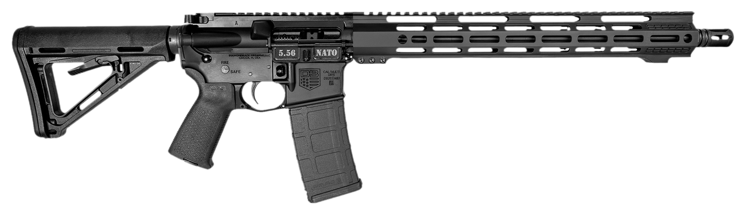 Sports South Exclusive. The Diamondback DB15 rifle is made entirely in the USA. The DB15 features a carbine length gas system; 16″ 4150 CrMov barrel; shot-peened, Magnetic Particle Inspected Mil Spec 8620 Carrier BCG; A3 flattop forged 7075 T-6 aluminum T-Marked upper, DB-15 Carbon lower; Magpul MOE 15″ M-Lok AV rail w/texture pads; full Picatinny rail; front & rear QD; hand stop; Magpul MOE grip; Magpul MOE carbine stock; standard Mil-Spec trigger and an A2 flash hider. Includes Magpul Gen M2 PMAG 30rd magazine.