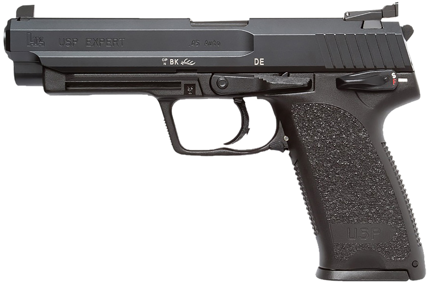 The USP series was developed in the early 1990s by Heckler & Koch engineers as the company’s first undertaking to design a handgun especially for the American civilian and law enforcement markets. Combining traditional blowback operation using a modified Browning locking system on a high strength polymer frame, the USP has a well earned reputation for reliably and robust simplicity. The USP Expert offers significant additional features making it a unique handgun designed for specialized applications. It combines elements of the USP Tactical, USP Elite, and Mark 23 with a long slide design. The result is a highly accurate pistol ideally suited to IPSC (International Practical Shooting Competition) and other practical target shooting applications. In addition to its longer slide the longest found on any HK pistol the USP Expert has the same adjustable target sights, ambidextrous control levers (with safe, fire and decock functions), and an O-ring barrel found on other specialized models of the USP.
