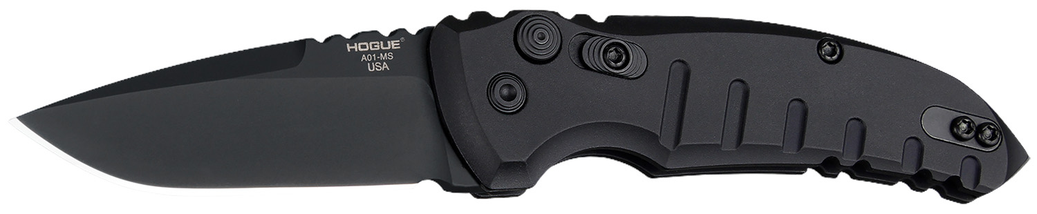 Hogue A01 microswitch folder with a 2.75″ drop point blade, matte black aluminum frame.