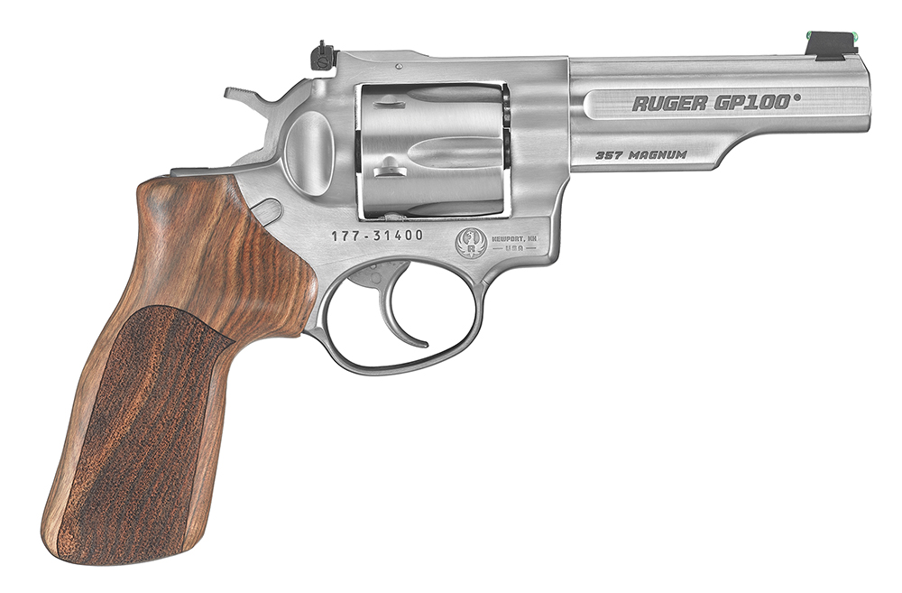 Ruger’s GP100 revolver features a triple-locking cylinder that is locked into the frame at the front, rear and bottom for more positive alignment and dependable operation. Its patented transfer bar mechanism provides an unparalleled measure of security, while the integrated sub-assemblies allows for easy maintenance and assembly. The grip frame design easily accommodates a wide variety of custom grips. The Match champion model features a contoured cylinder, Hogue hardwood grip with stippled sides and a slab-sided, half-lug target crowned barrel.