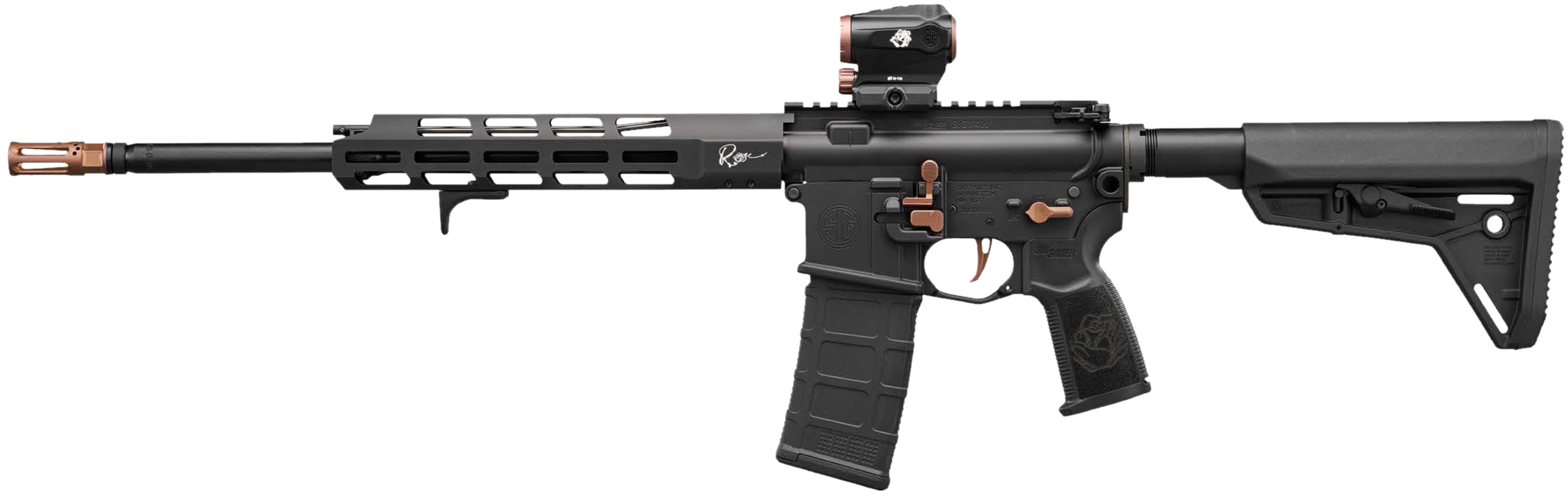 The M400-ROSE was designed as a direct request from ROSE members who wished to extend their firearm journey into the world of AR-15 rifles. At the core of the M400-ROSE is a lightweight rifle chambered in the popular 5.56 NATO cartridge that is easy to operate while offering minimal felt recoil. Features a 10″ M-LOK handguard w/ROSE Engraving; ambidextrous controls for both left and right-handed shooters; adjustable 6-postion Magpul SL stock; ROSE Engraved AR-Style Grip and matte rose gold colored controls. The Rose kit includes a ROMEO5 GENII red dot w/ROSE logo, custom ROSE Savior soft-sided carrying case, three rose-colored dummy rounds, rose gold combination lock and two 30rd magazines.