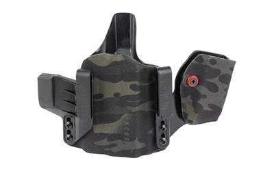 An ergonomic, mission-adjustable, RDS-compatible, multi-positional, deep concealment IWB hybrid thermoplastic holster. Its distinctive features enable concealed carry for a wide range of handgun fits from various carry positions while allowing a full firing grip prior to drawing. The design includes passive retention and adjustable tension, enabling a finely tuned fit and smooth draw. This evolution of the IncogX features a series of clips that provide more adaptability to the user while maintaining the original goals of improved grip, concealment, and function. The clips open outward and slide down with the holster, naturally locking over the belt. An actuated finger tab flexes to open, allowing quick installation or removal from the belt. An improved clip strut design combines functionality with customized concealment shims that can be easily installed or removed without tools. All IncogX models come with clip strut shims in three different concealment sizes: 1/8″, 1/4″, and 3/8″.