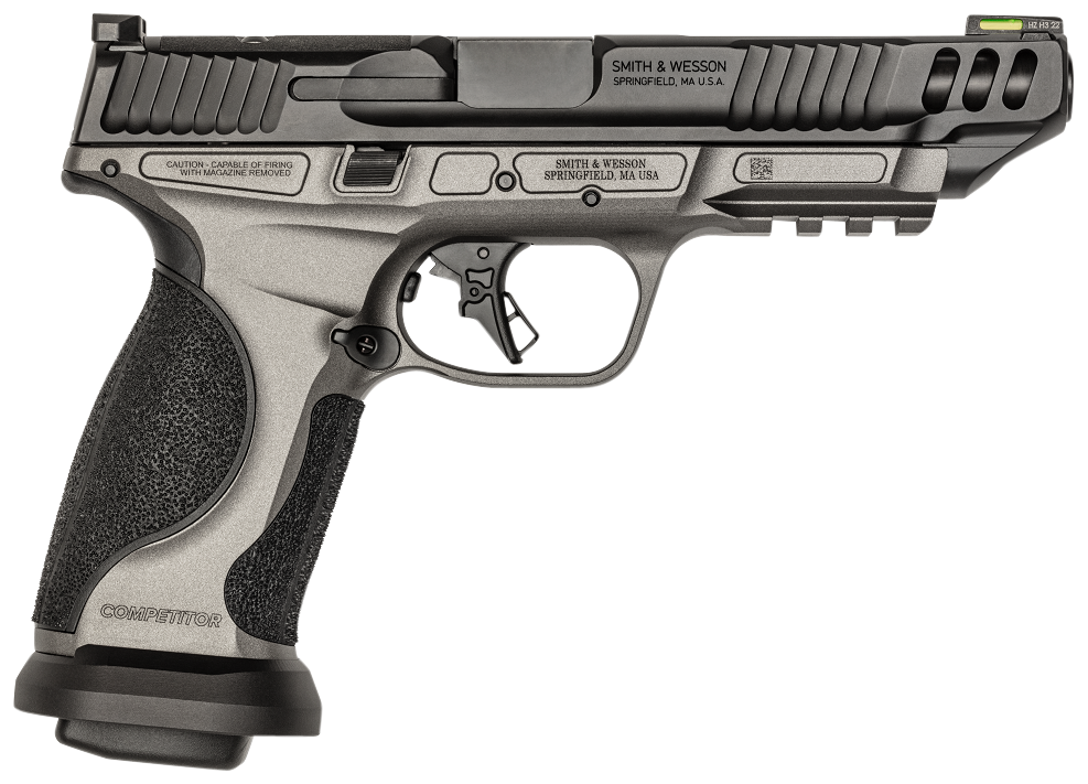 Built for competition right out of the box, this metal-framed 9mm pistol is designed to give competitive shooters the edge. The Competitor comes with a 5-inch barrel, has an enhanced sear for lighter, crisper trigger let-off, and includes a flared magazine well for fast and efficient reloads. Boasting a new look, the aggressive lightening cuts on both the top and sides of the slide ultimately reduce the amount of weight in front of the chamber and, in return, help improve the recoil balance point. The slide is cut for optics, includes a fiber optic front sight, and blacked out serrated rear sight. The Competitor comes with an oversized mag release that is reversible for both right and left-handed users and ships with a total of four magazines. Choose from models available in 10+1 or 17+1 round capacities with a Tungsten Gray Cerakote® or black Armornite® slide finish. Smith & Wesson is proud to introduce the Performance Center M&P9 M2.0 Competitor.