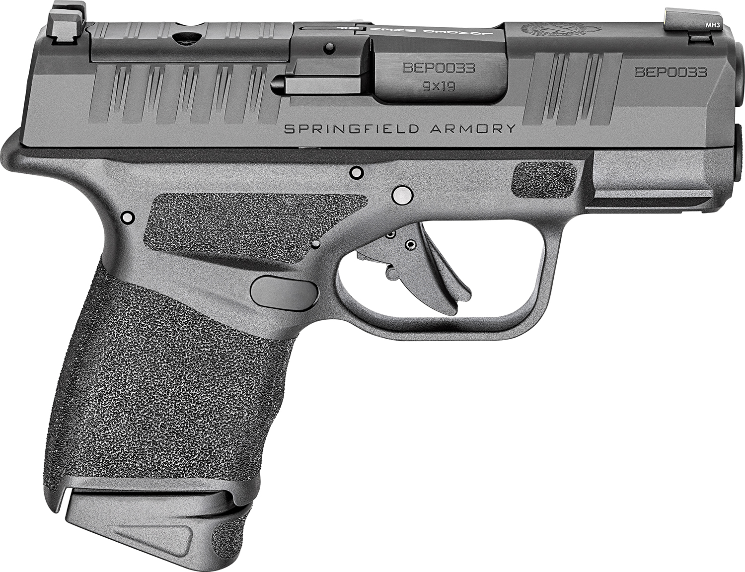 Springfield Armory micro-compact Hellcat features unique top slide serrations to maximize your grip on the slide; non-proprietary accessory rail allows you to accessories with your favorite light and/or laser; Tritium/Luminescent front sight, Tactical Rack U-Notch rear sight; reversible mag release, loaded chamber indicator and custom pressure activated grip texture. Gear Up 25 package includes Crimson Trace CT-1500 Red Dot Optic, 5 magazines and dual range bag.