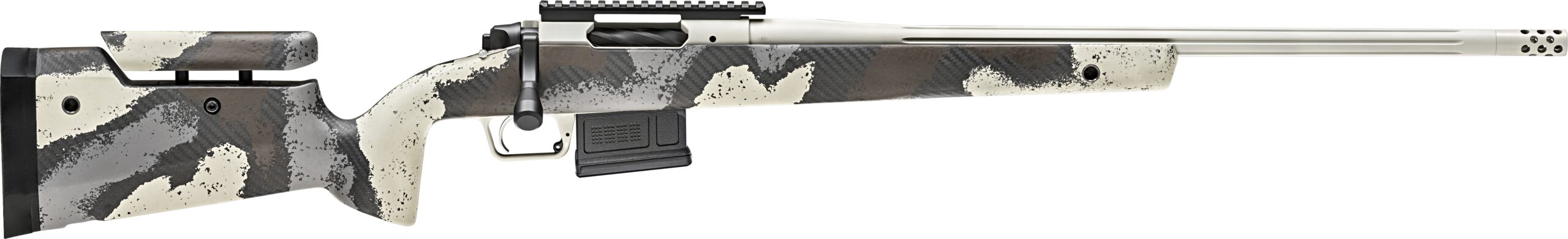 Brand: Springfield Armory Model: 2020 Waypoint Model Number: BAW92265CMDA Caliber: 6.5 CRDM Type: Rifle Action: Bolt Barrel Length: 22″ Capacity: 5 Features: 0.75 MOA Guarantee Fluted Stainless Steel Barrel Carbon Fiber Stock with Adjustable Cheek Comb Custom Painted Camo TriggerTech Trigger (Adjustable 2.55 lbs) SA Radial Muzzle Brake AICS Pattern Magazine Pachmayr Decelerator Recoil Pad