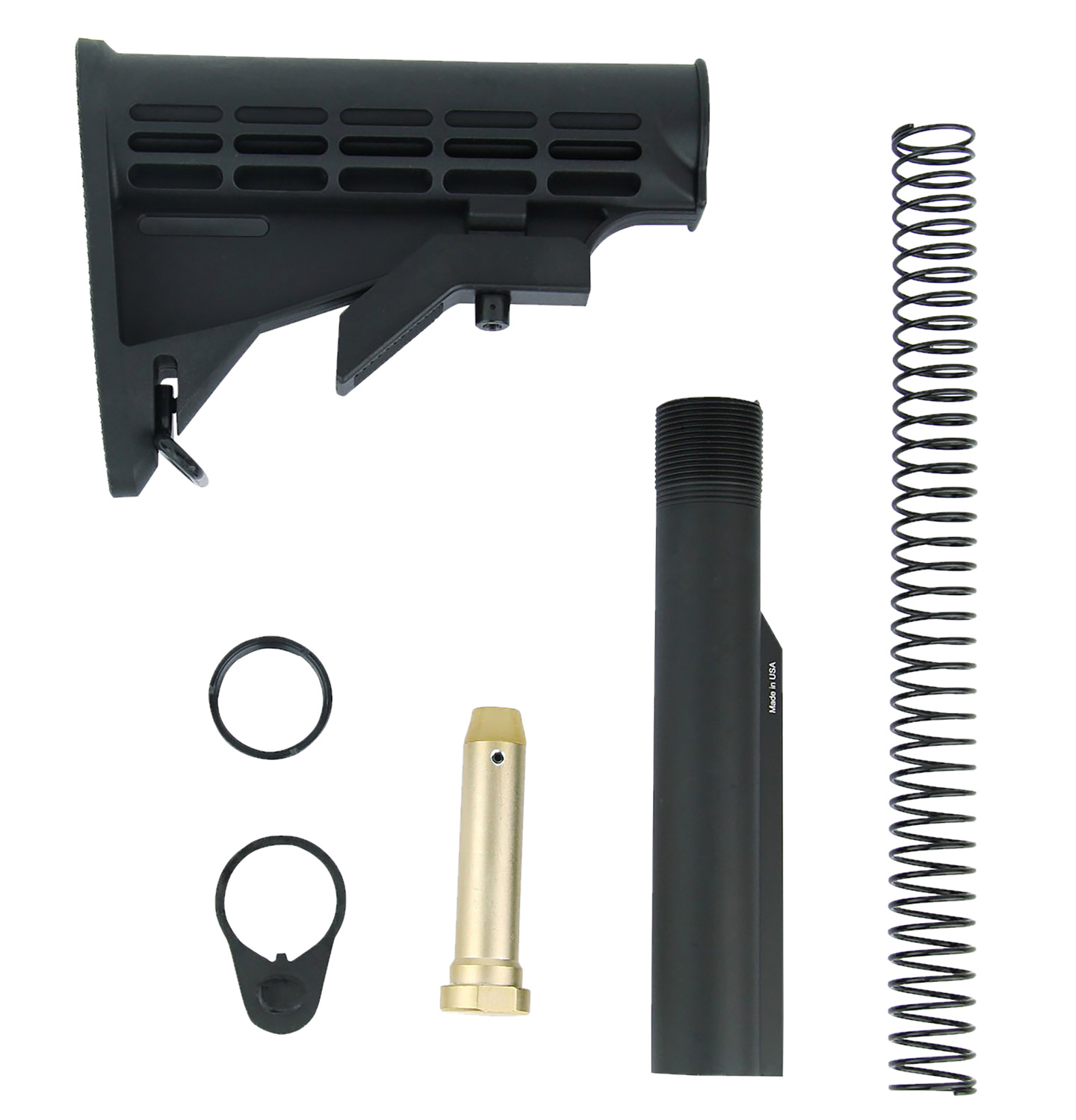Mil-Spec Stock Kit Includes:(1) Mil-Spec 6 Position Buffer Tube, (1) M4 Style Stock, (1) 3 oz. Buffer, (1) Carbine length buffer spring, (1) Regular End Plate, (1) Castle Nut