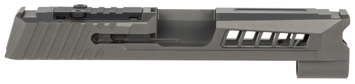 The Axiom Slide offers a sleek design with lightweight side-cut windows and a top-milled pocket for enhanced aesthetics and performance. The slide boasts advanced aggressive reduced and scalloped front and angled rear serrations providing a superior grip and making it easy to use. Equipped with an optic cut footprint, it’s ready for various Trijicon RMR and Holosun optics.