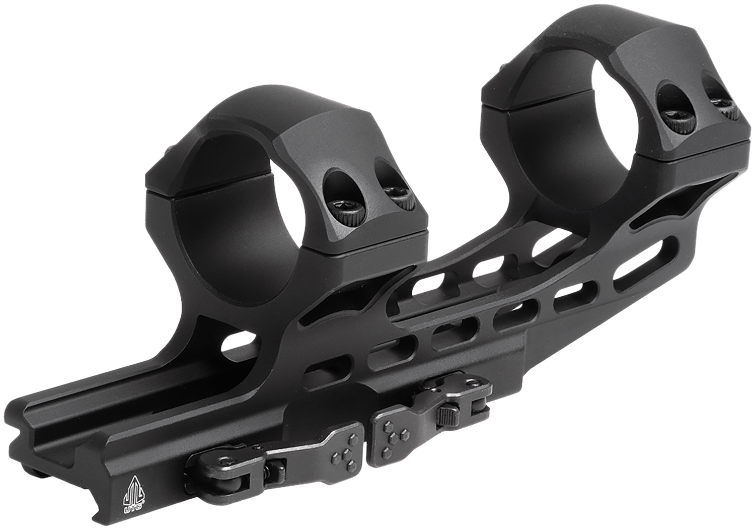 The UTG ACCU-SYNC 30 mm QR Picatinny Cantilever Mount is designed for 30 mm tube optics, offering a 50 mm offset, high-profile design, and a 22 mm saddle height. It features precision CNC machining from 6061-T6 aluminum with a matte black anodized finish for strength and durability. The quick-release (QR) mount allows for tool-free tension adjustment and includes locking QR levers and squared recoil stops to ensure a secure zero hold and return to zero after removal. The mount also prevents forward and rearward movement under recoil, is rated for .338 LAPUA Magnum, and accommodates even out-of-spec Picatinny rails. Additionally, it has snag-free radiused edges, melted contours, and lightening cuts to reduce weight without compromising strength. The mount’s locking quick-release levers prevent inadvertent release, making it a reliable option for tactical and precision shooting setups.